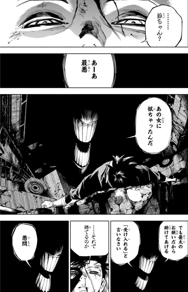 失踪直前、憂太の息子は(真剣と憂花の父)はフードを被った口に傷のある男(恐らく虎杖)に食ってかかる所を目撃されている